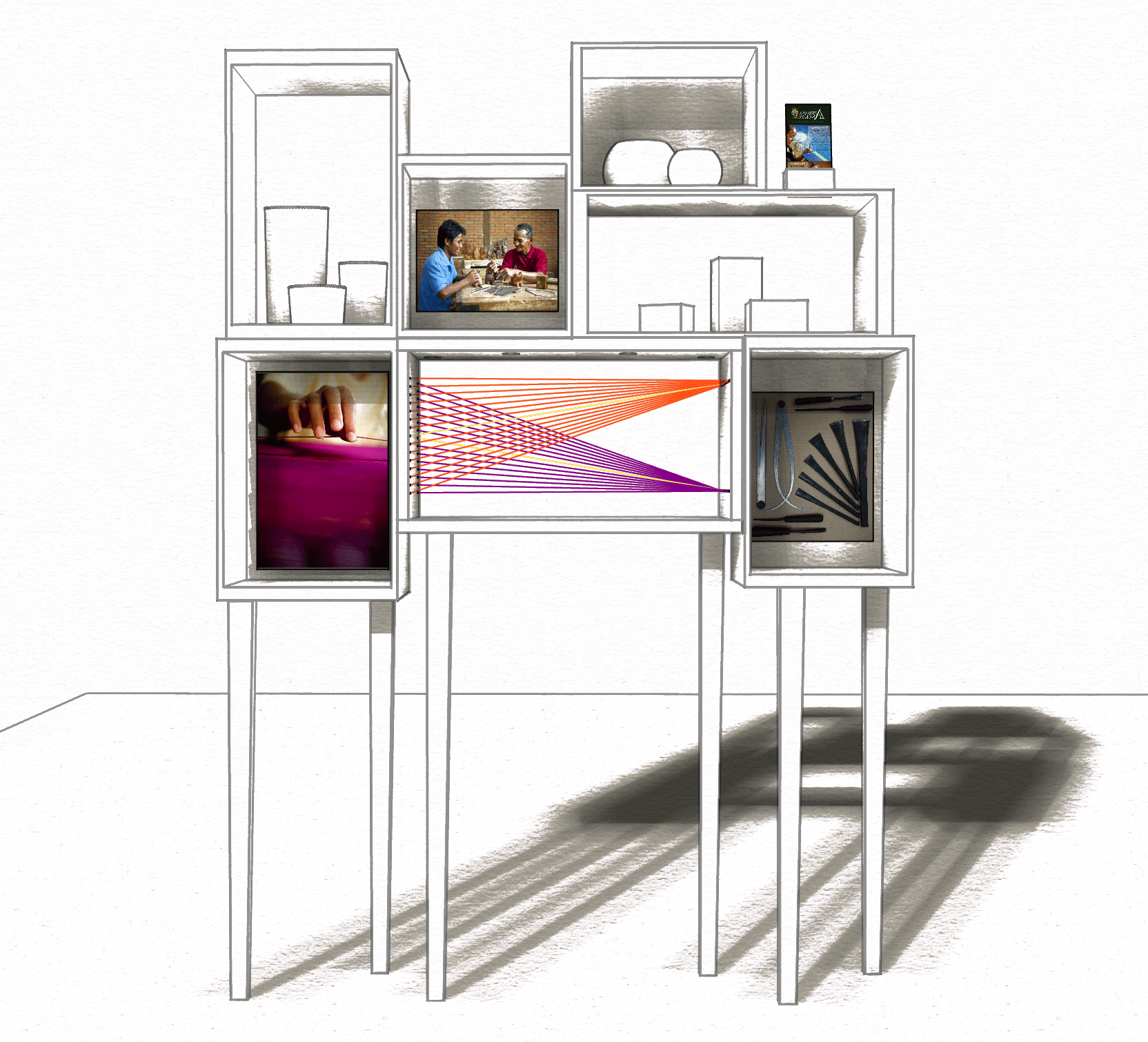 La première déclinaison du projet fut celle d’une gamme de mobilier modulable, destiné à présenter le travail des artisans auprès des réseaux touristiques locaux (hôtels de luxe, maisons d’hôtes, centres touristiques éthiques etc.)